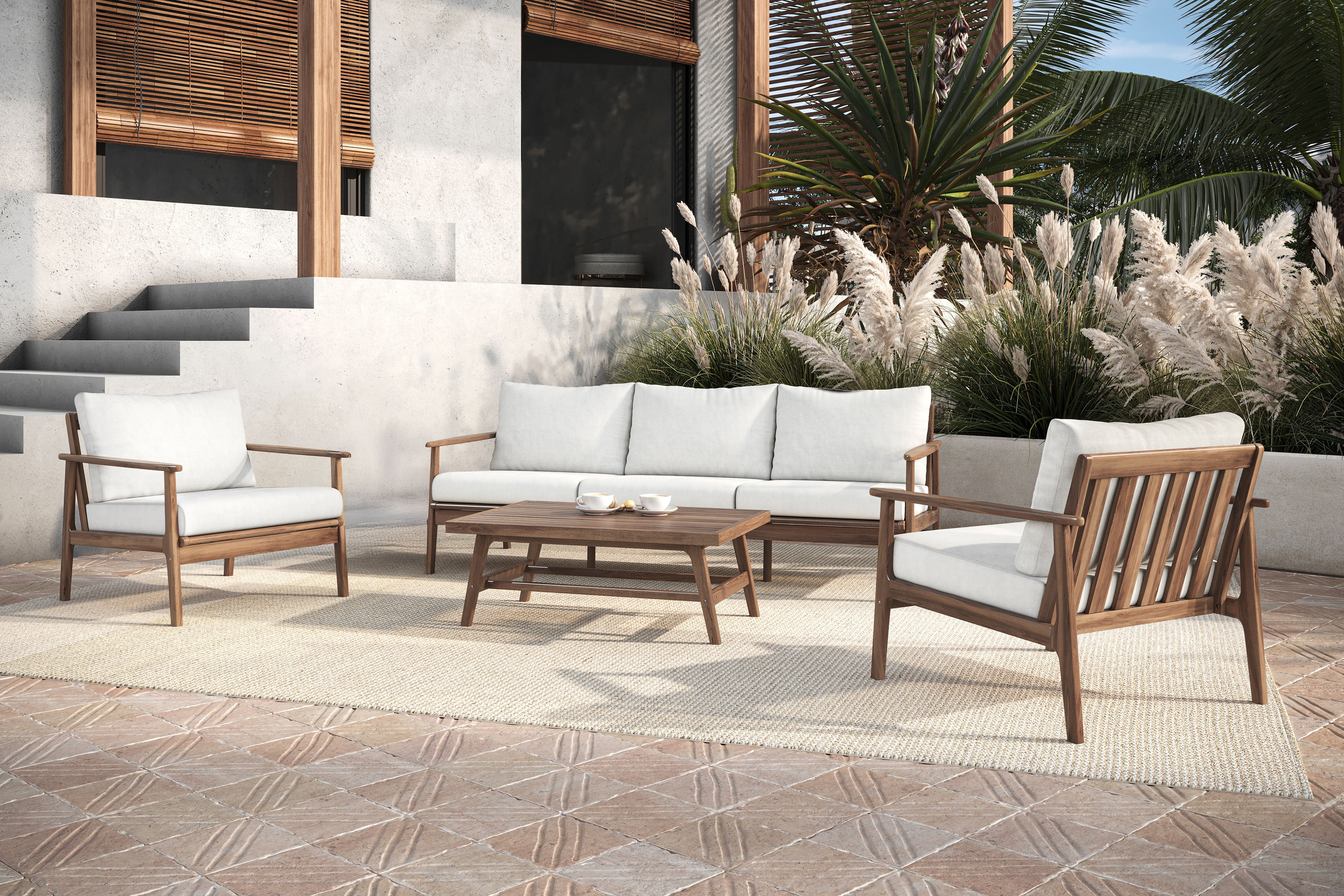 The Ashton Patio Set seamlessly blends durability, comfort, and timeless design to create the ultimate outdoor retreat. Expertly crafted from FSC-Certified Acacia solid wood, this set offers exceptional strength and natural resistance to the elements, ensuring long-lasting beauty and reliability. A meticulously applied light, clear multistep finish enhances the wood''s rich texture and color while adding a protective layer for superior outdoor durability. The sofa is designed for lasting comfort with plush, high-density 12cm foam seat and back cushions, upholstered in exclusive Sunduraโ„ข fabricโ€”a solution-dyed 100% polyester that resists fading, mildew, and moisture, keeping the set vibrant and fresh year after year. With clean, straight lines, slatted backs, and a low-profile frame, this minimalist design delivers sleek functionality and modern elegance. The slatted tabletop not only adds a classic touch but also improves water drainage for practical outdoor use. Each piece showcases one-of-a-kind wood grain variations, offering unique patterns and organic details that bring timeless beauty and authentic charmโ€”ensuring no two pieces are ever exactly alike.