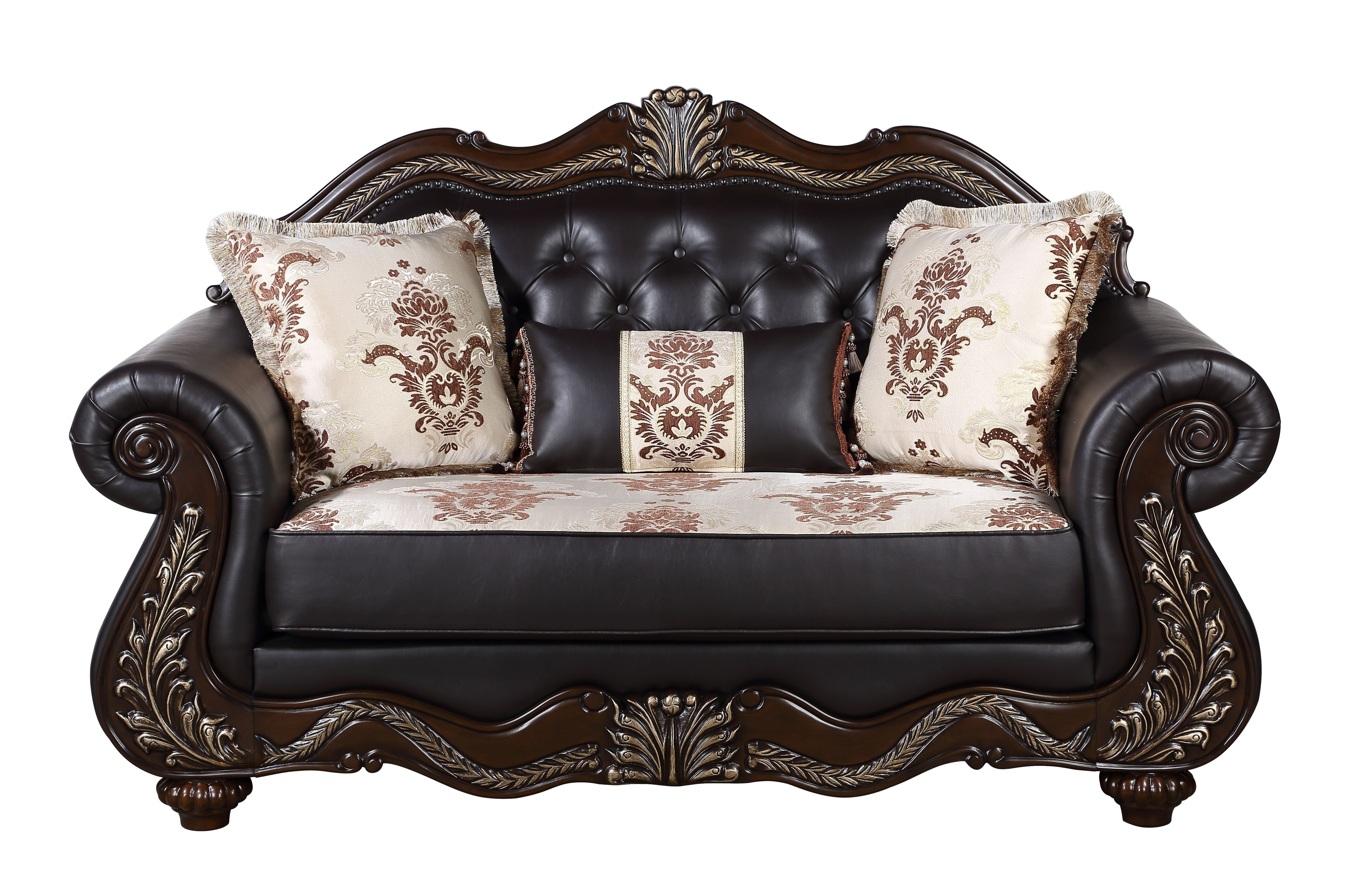 The Royal Classics Maximus Living Room Loveseat combines heirloom-quality craftsmanship with timeless design, offering both beauty and durability for any refined living space. Constructed from solid pine with premium polyurethane carvings, this loveseat is resistant to moisture, rot, and cracking, ensuring that the intricate details remain intact with minimal maintenance. The multi-step finish enhances the natural wood grain, while delicately burnished gold tipping adds a touch of luxury to the ornate carvings. Featuring a traditional Baroque design, the loveseat''s intricate Rococo-inspired details exude a sense of regal elegance and sophistication. Upholstered in rich brown vegan leather, and accented with soft-textured and elegantly patterned pillows, this loveseat offers both style and comfort. Button-tufted backs and nailhead trims trace the graceful curves of the wood frame, adding the perfect finishing touches to the piece. For convenience, the upholstery backs and bases are shipped separately to ensure hassle-free transport and easy setup, making this loveseat as practical as it is stylish for any sophisticated living space.