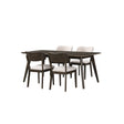 The Piece Mid-Century Modern Wood Dining Set is an ideal blend of style and practicality for your dining space. This set includes a 72' rectangular dining table and chairs, all crafted from solid rubberwood, manufactured woods, and oak veneers for superior stability and longevity. The classic mid-century modern design features a minimalist aesthetic with clean lines, rounded edges, and angled, tapered legs, evoking a timeless elegance. The multi-step walnut brown finish, hand-rubbed with a clear topcoat, highlights the natural beauty of the wood grain. The chairs offer comfortable seating with softly rounded backrests and resilient foam seat cushions wrapped in 100% easy-care polyester fabric. This spacious dining table provides ample room for six, making it perfect for both everyday meals and special gatherings. Enhance your dining experience with this durable and stylish dining collection.