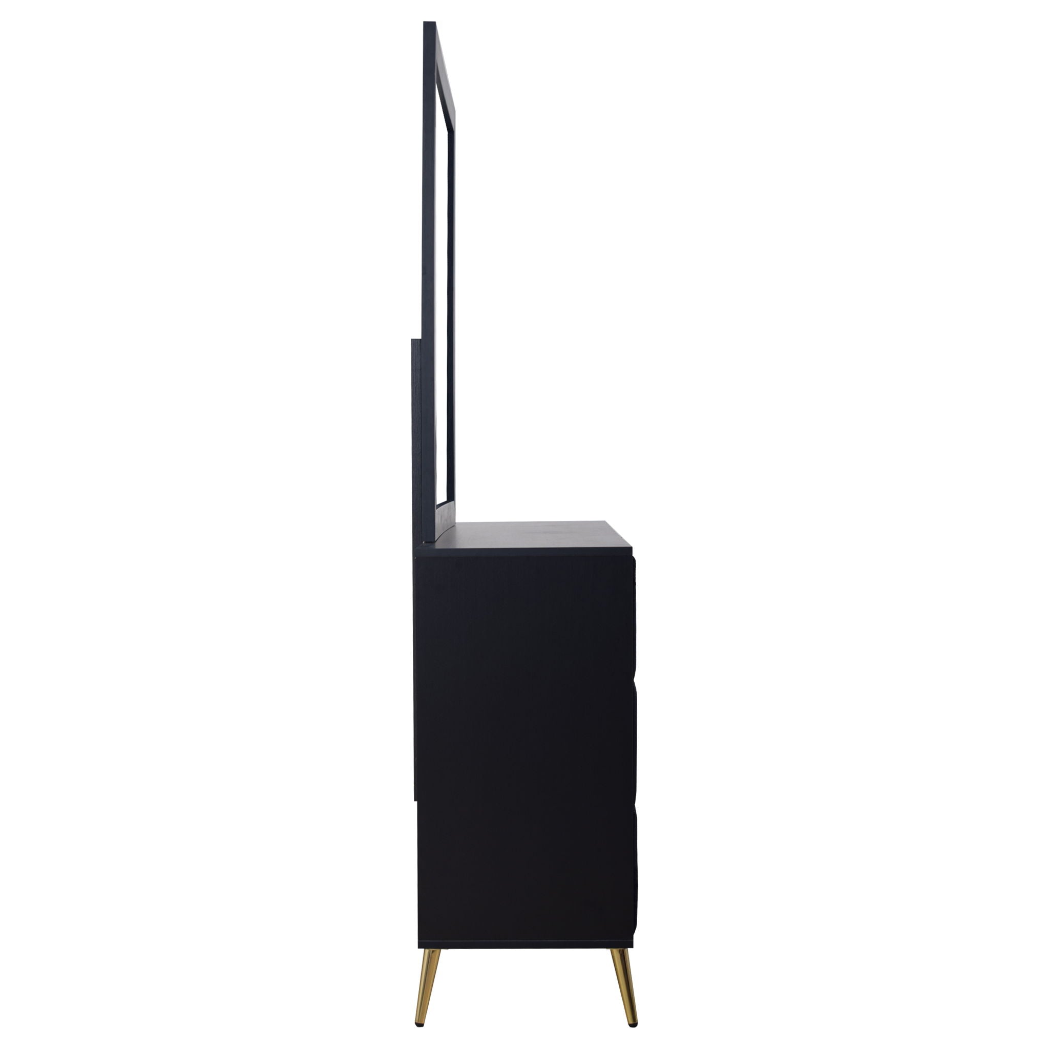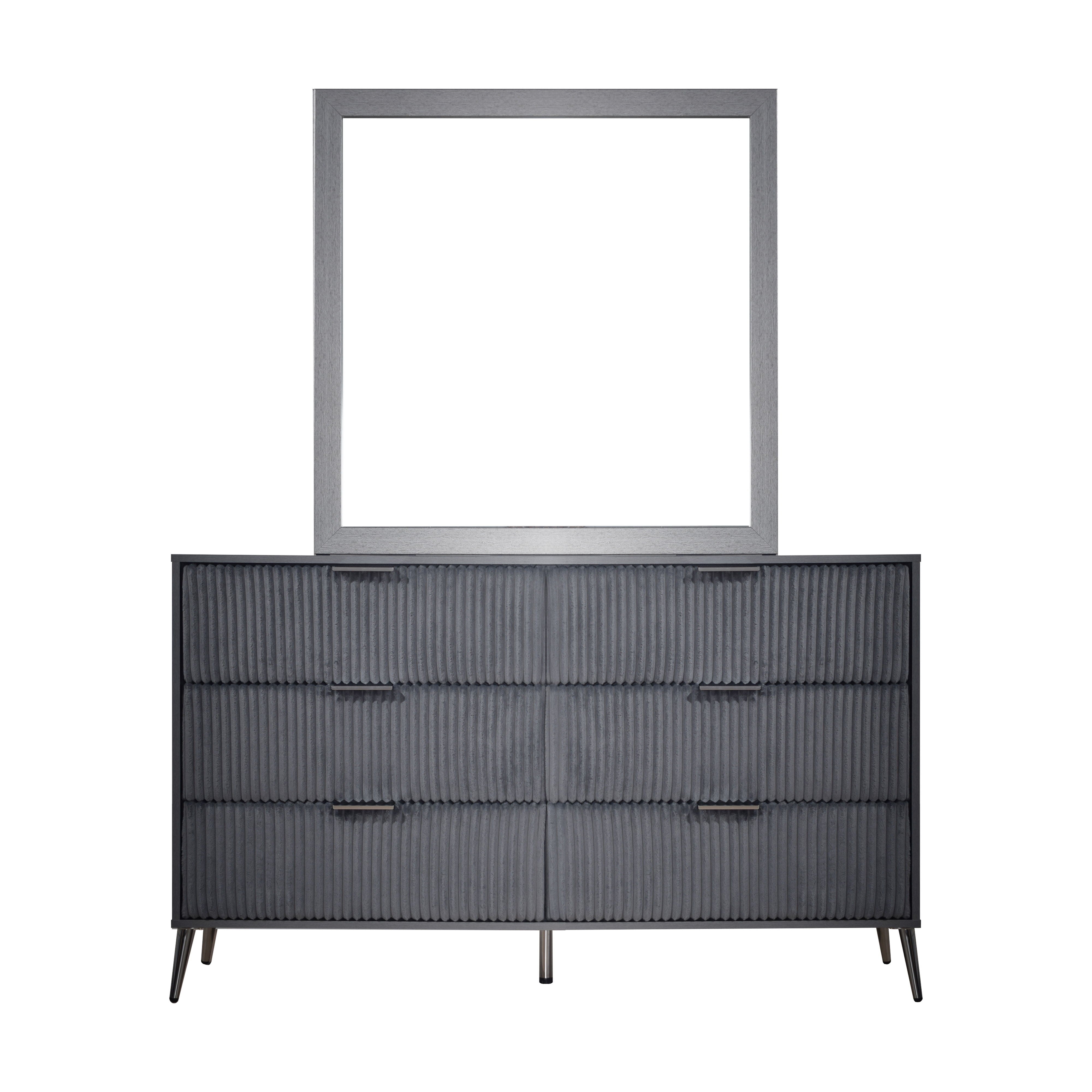 The Kailani 2 Piece Dresser and Mirror Set is a stunning combination of modern design, durability, and eco-friendly craftsmanship, making it an elegant addition to any bedroom. This set includes a dresser and mirror, both expertly crafted from a blend of solid rubberwood, engineered wood, and eco-friendly decorative laminate. The durable construction ensures the furniture maintains its beauty with minimal maintenance, offering superior resistance to scratches, moisture, and stains. The modern minimalist design, featuring clean lines, a sleek silhouette, and a chic ribbed texture, is enhanced by slim metallic handles and tapered legs, adding a sophisticated yet functional touch to your space. The dresserโ€™s textured drawers, wrapped in luxurious 100% Polyester Velvet and accented by gleaming gold pulls and angled legs, bring a touch of glamour to the room. The low-distortion mirror offers crystal-clear reflection, combining both function and elegance. Thoughtfully designed for seamless form and function, the spacious drawers glide effortlessly on full-extension slides and are reinforced with durable dovetail joinery, ensuring smooth operation and lasting strength. The Kailani Dresser and Mirror Set is a perfect blend of style, function, and sustainability, making it a standout choice for your bedroom.