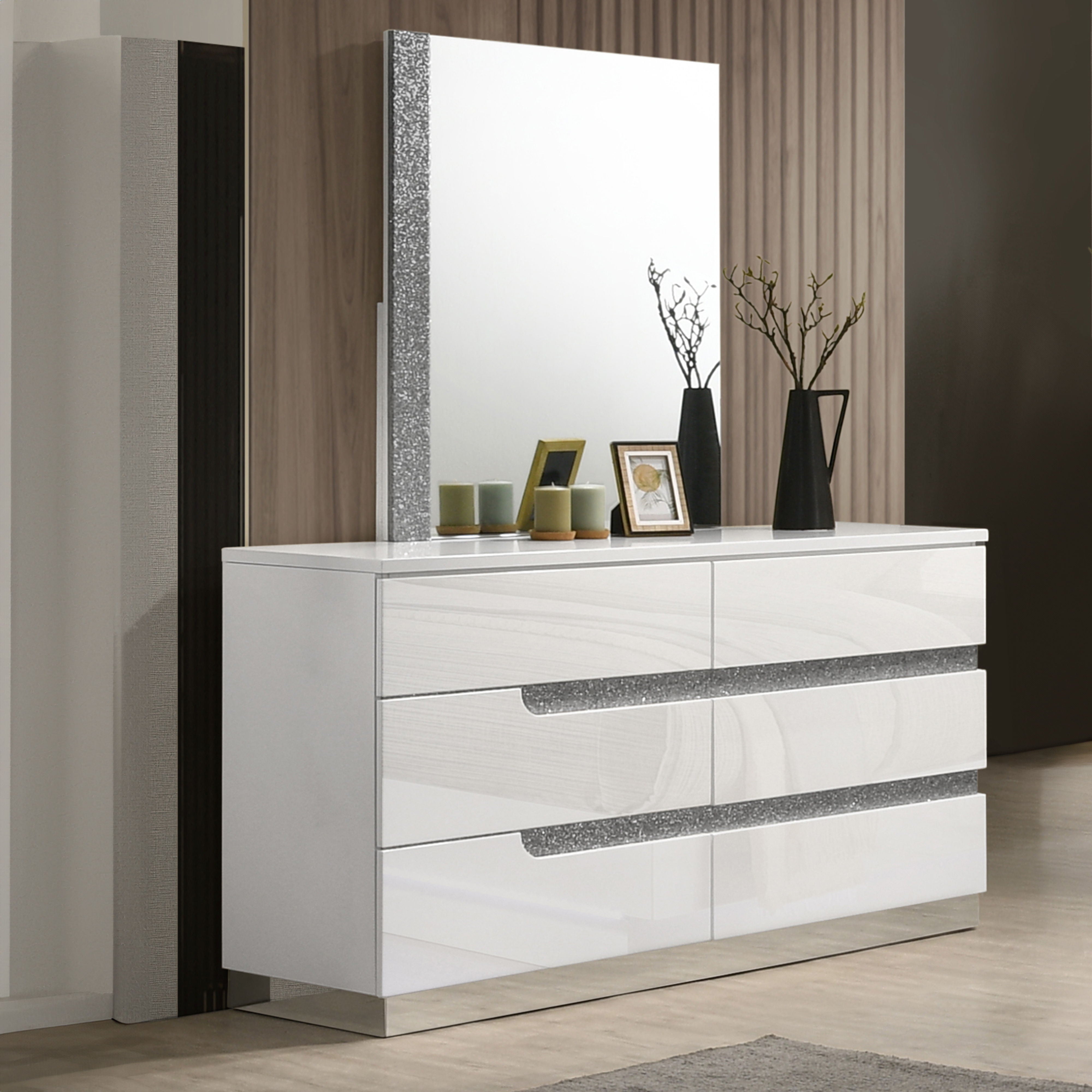 The Paradox Six Drawer Dresser combines contemporary appeal with robust functionality. Its gleaming gloss laminate finish offers a sleek, modern look while providing the practical benefits of scratch and water resistance. Crafted from a combination of solid and manufactured woods, this dresser ensures long-lasting durability. The fully finished drawers offer snag-free storage and glide effortlessly on full-extension, ball-bearing drawer glides. The show-stopping design, featuring a modern finish and glittering silver mylar inlays, transforms your bedroom into a high-style retreat. With six spacious drawers, this dresser provides ample storage space for all your clothing, making it an essential and stylish addition to any bedroom.