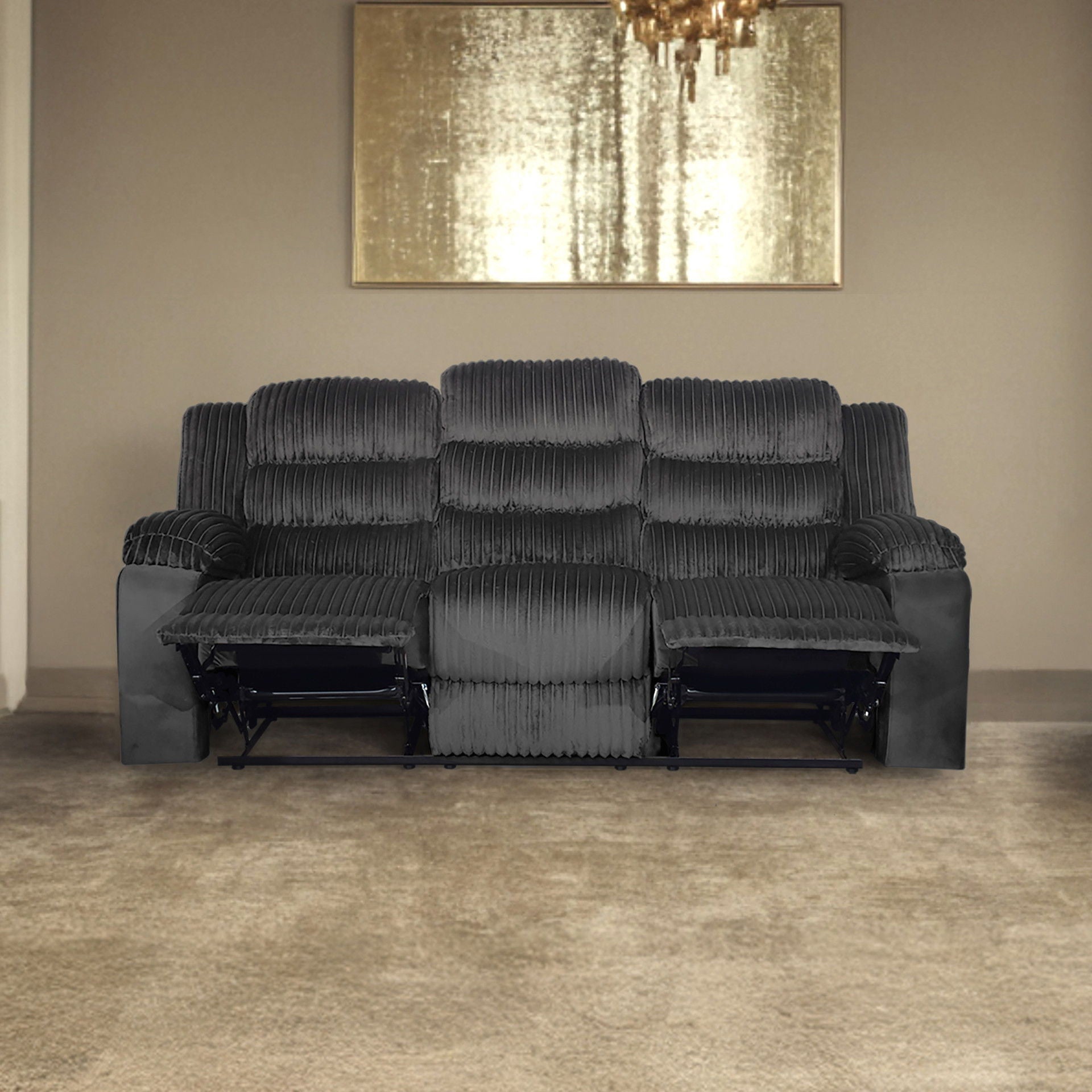 The Willow Sofa combines quality construction and contemporary comfort, making it a perfect addition to any living space. Built with hardwood and plywood interior frames and sturdy motion mechanisms, it provides a long-lasting foundation for your furniture needs. The ultra-soft 100% polyester fabric offers a luxurious blankety-soft texture that gently lulls you into relaxation. With supportive seating, it ensures optimal comfort through the combination of a supportive spring structure and plush foam, maintaining the sofa's shape and support over time. The modern design features clean lines, plush ribbed upholstery, and a relaxing reclining mechanism, which, paired with its two recliners, makes the Willow Sofa an ideal choice for living rooms and home theaters.
