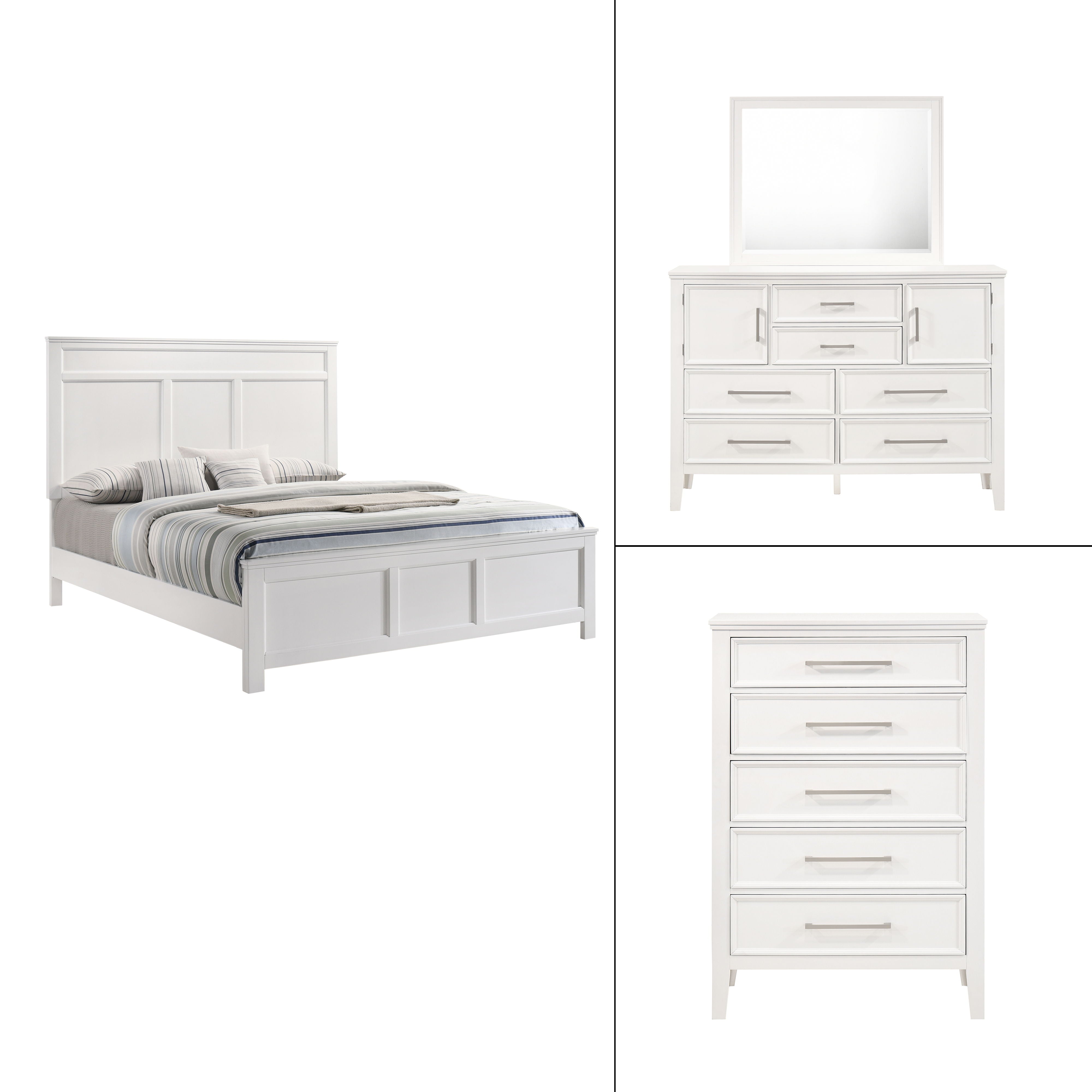 The Andover Wood 4-Piece Bedroom Set in White offers a perfect combination of durability, style, and functionality, making it an ideal choice for a complete bedroom upgrade. This set includes a Panel Bed, Dresser, Mirror, and Chest, all expertly crafted from solid Rubberwood, manufactured woods, and wood veneers, ensuring long-lasting durability while showcasing the natural beauty of real wood. The semi-gloss white finish delivers a crisp, versatile appeal that complements both modern and traditional dรฉcor styles, effortlessly enhancing your space with a fresh, refined look. The Andover collection''s clean lines and understated contemporary design create a seamless and cohesive aesthetic, with sleek, elongated metallic handles that add a sophisticated contrast to the pristine white finish. Framed drawer fronts provide visual depth and dimension, while sturdy block-style legs ensure a solid foundation that underscores the collection''s robust and enduring construction. The drawers glide smoothly on Kenlin drawer glides and feature dovetail joinery, reflecting superior craftsmanship and lasting quality. This set brings together timeless design and practical functionality, making it a stylish and enduring addition to your bedroom.