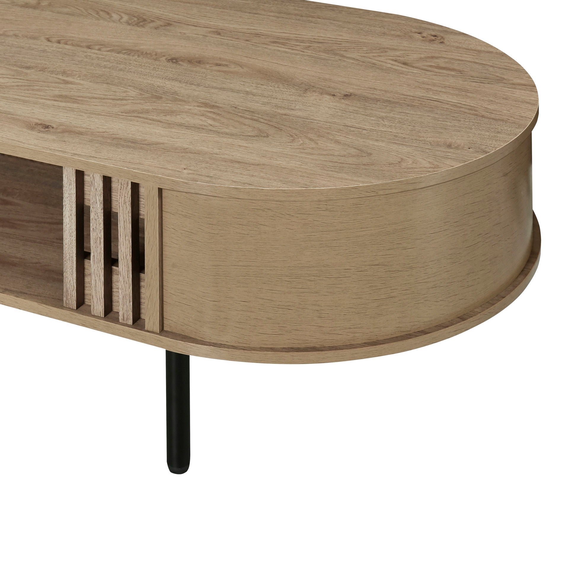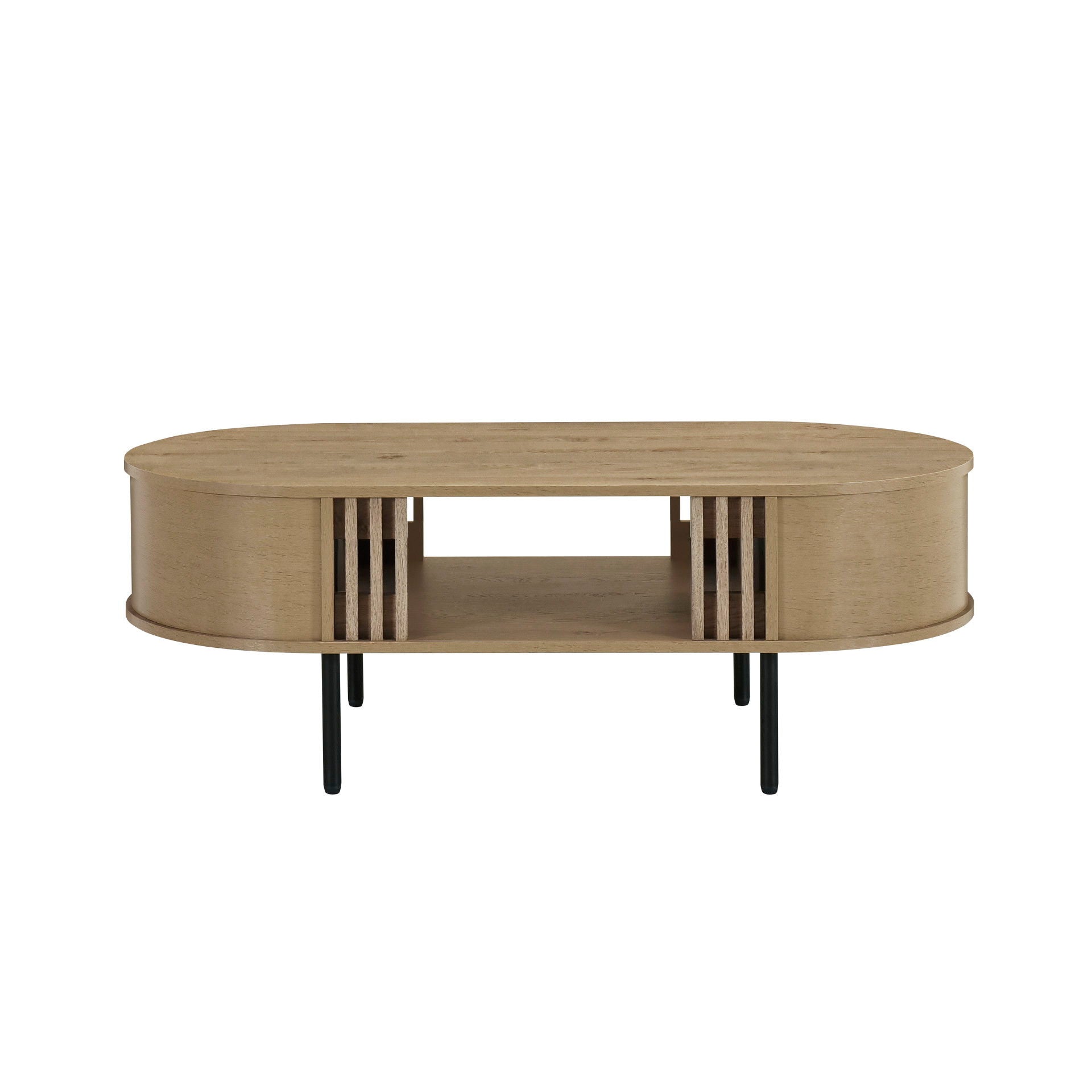 Discover the perfect blend of style and functionality with the Brax Coffee Table/Cocktail Table. This sleek and sustainable table is constructed from manufactured wood covered in durable, environmentally friendly decorative laminate. The 47' table offers ample top surface area for drinks and decoration, while the lower storage shelf is perfect for keeping reading materials, remotes, and more within easy reach. The black metal legs and rounded edges add a contemporary touch, while tambor style moldings add character and distinction. The light, natural beige finish complements a variety of dรฉcors, making this table a versatile addition to any living space.