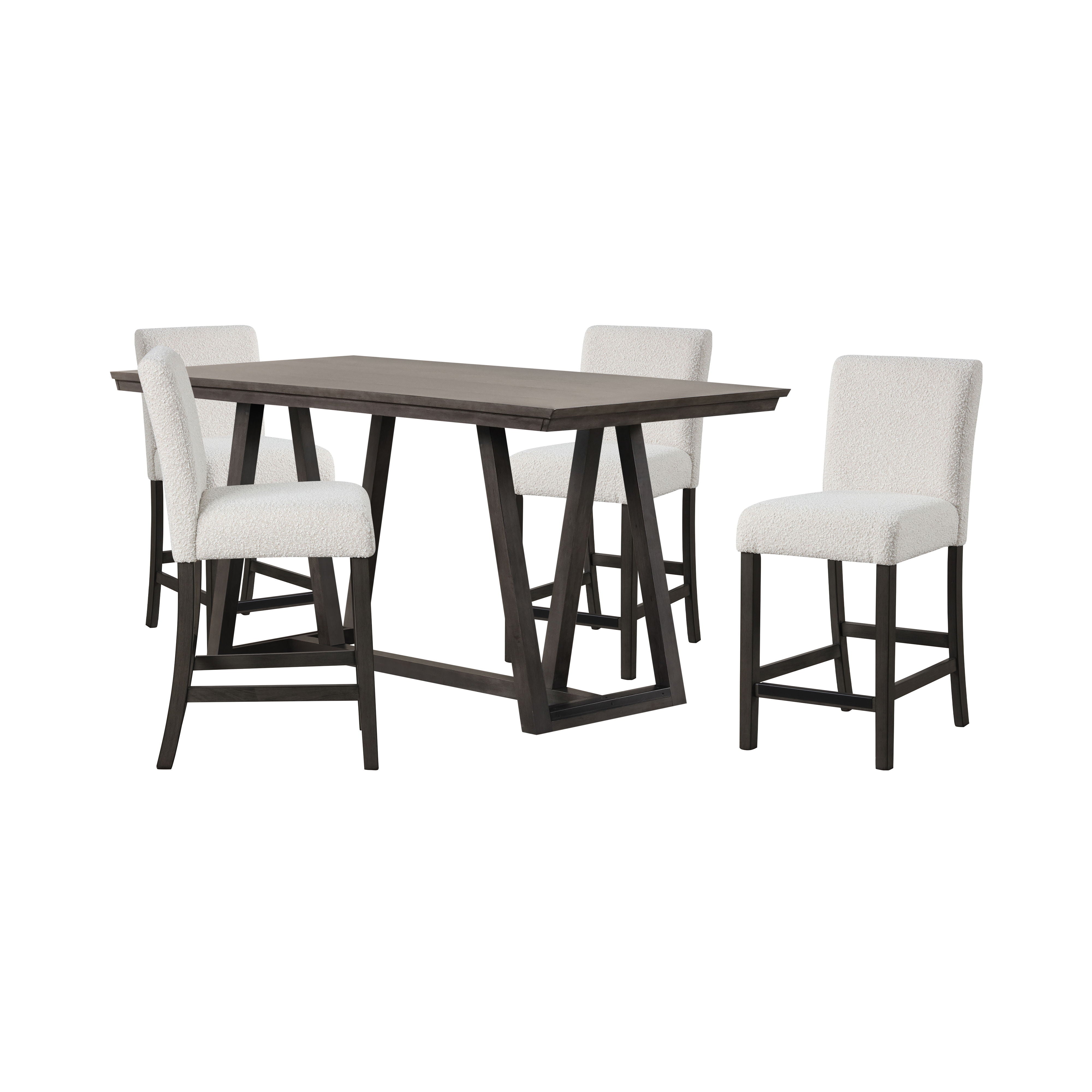 The High Line Counter Dining Set is the perfect blend of style, durability, and comfort for your home. Expertly crafted from solid Acacia and Rubberwood, along with high-quality manufactured woods and Birch veneers, this set guarantees durability and stability for long-term use. The fresh, contemporary finish features a meticulously hand-applied, multi-step process, resulting in a smooth, matte hue with sophisticated undertones. This finish, combined with subtle wood grain patterns, creates a sleek and modern ambiance, ideal for contemporary spaces. The chairs are upholstered in luxurious bouclรฉ fabric, known for its exceptional durability and plush comfort, making them perfect for frequent use. The unique looped texture adds an element of elegance and ensures the longevity of your seating. The table''s flat, rectangular top and crisscross leg design emphasize functionality and simplicity while adding visual interest and stability, making it a versatile addition to any room, from dining areas to workspaces. This set comfortably seats up to six guests, with the spacious table and comfy chairs upholstered in 100% easy-care polyester fabric, blending elegance with practicality. The High Line Counter Dining Set offers a stylish, functional, and durable solution for your dining needs.