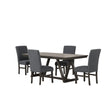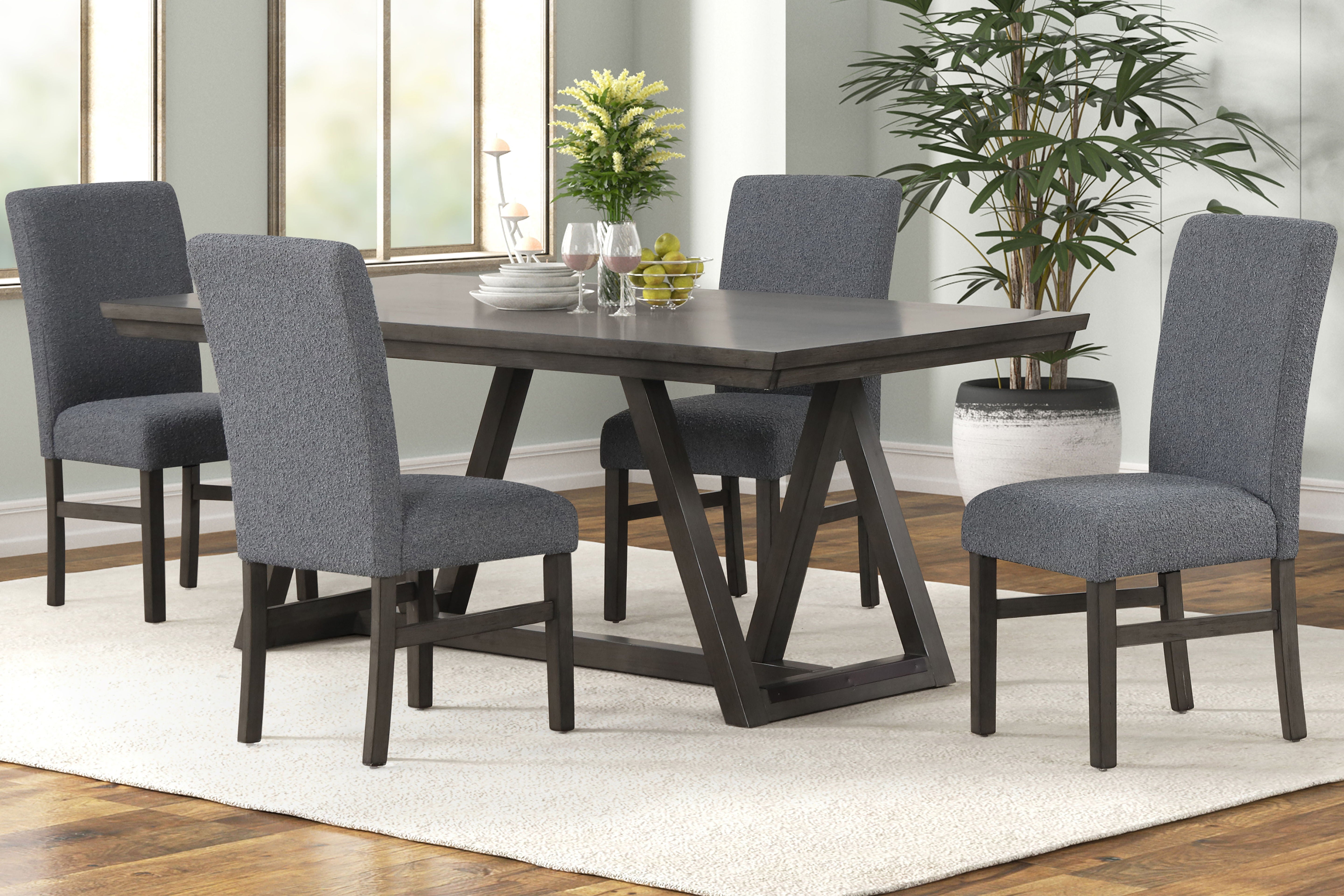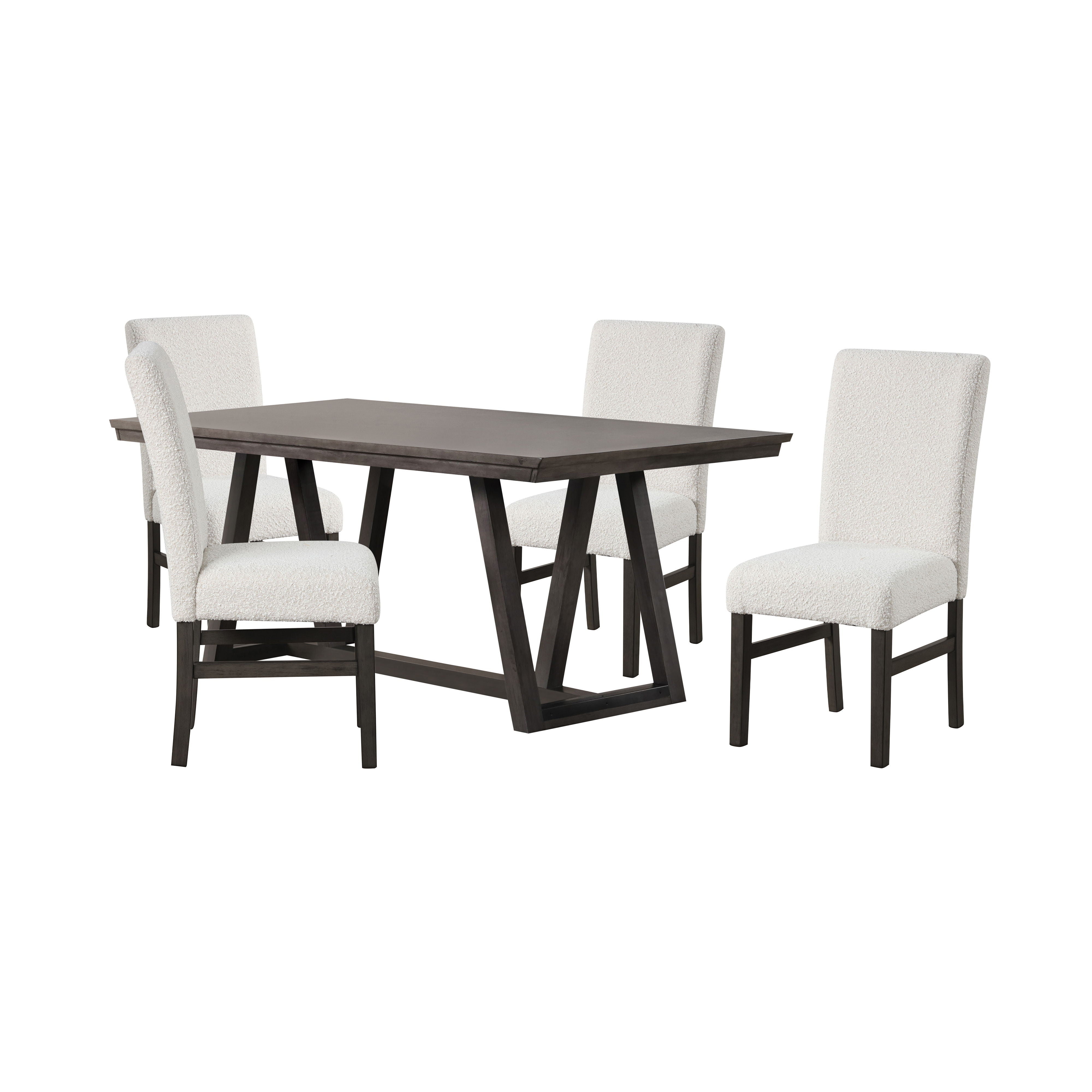 The High Line Dining Set is designed to be the centerpiece of your dining experience. Including one trestle dining table and upholstered side chairs, this set is built to last, expertly crafted from solid Acacia and Rubberwood, enhanced with high-quality manufactured woods and Birch veneers, ensuring unmatched durability and stability. The meticulously hand-applied, multi-step finish features a smooth, matte hue with sophisticated undertones, creating a modern, sleek ambiance that fits perfectly in contemporary spaces. The chairs, upholstered in luxurious bouclรฉ fabric, offer exceptional durability and comfort, making them ideal for frequent use. The unique looped texture adds both elegance and longevity to your dining area. The tableโ€™s flat, rectangular top and crisscross leg design emphasize functionality and simplicity, making it a versatile addition to any room, from dining areas to workspaces. This dining set comfortably seats up to six guests, with the plush chairs upholstered in easy-care polyester fabric, blending elegance with practicality. Make this unparalleled dining set a marvel of your home, combining style, comfort, and lasting quality.