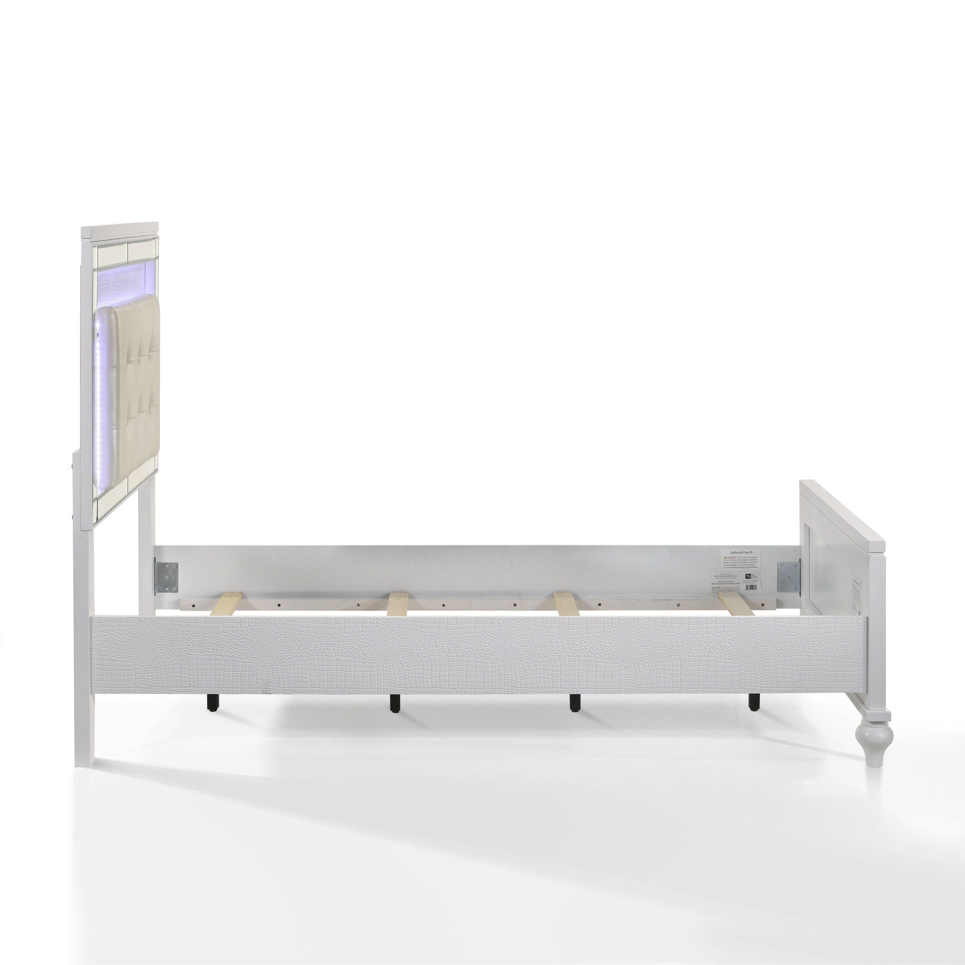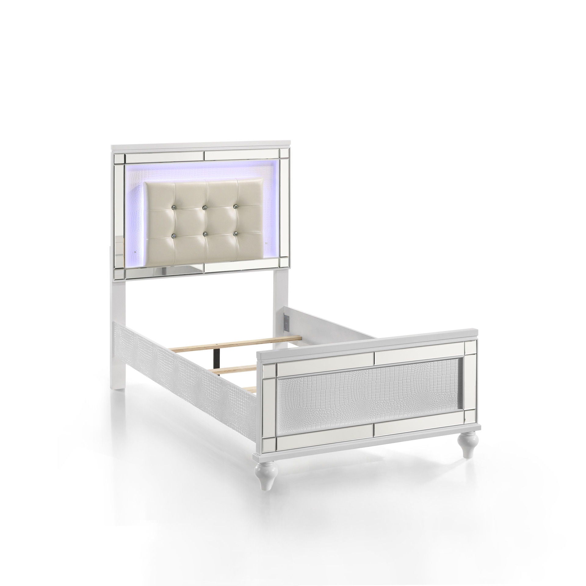 • Glitz and Glam Details: Crystal button tufted padded headboard, gleaming White finish and mirrored trims evoke a Hollywood glam appeal.