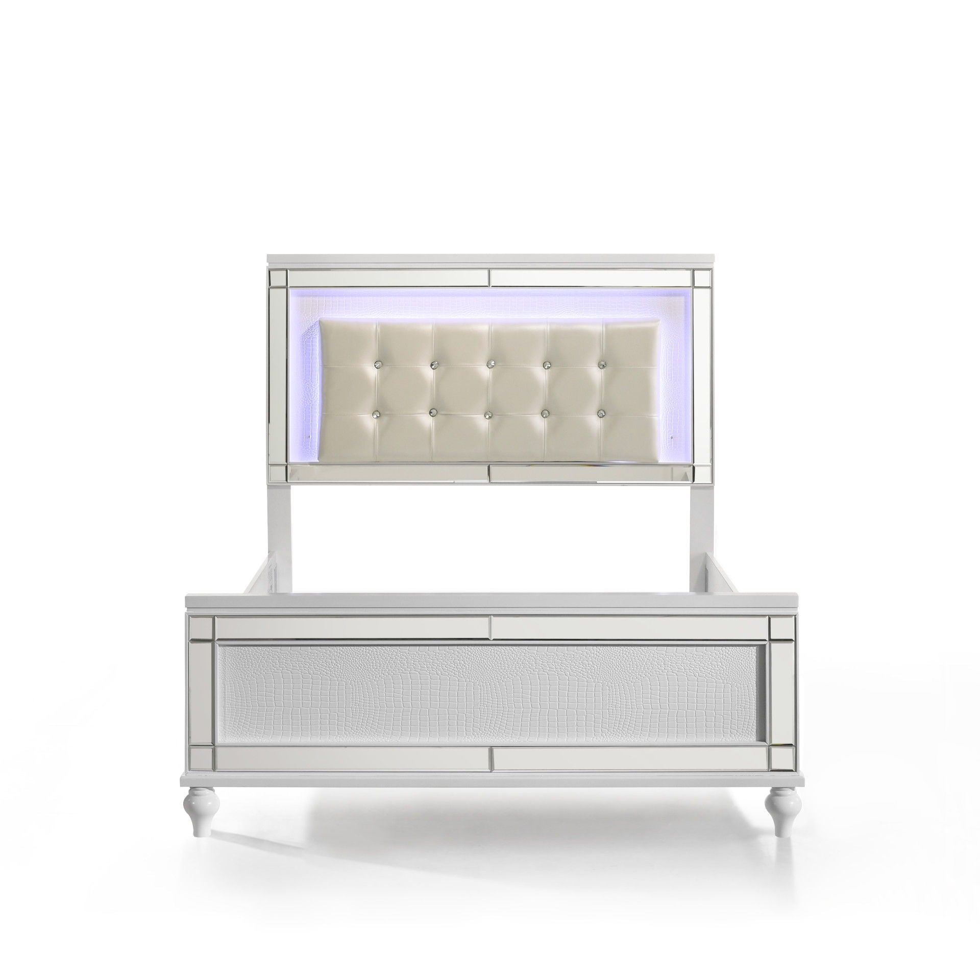 • Glitz and Glam Details: Crystal button tufted padded headboard, gleaming White finish and mirrored trims evoke a Hollywood glam appeal.