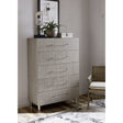 Chic and smart. Made of high-quality Oak veneer, the Argento collection is washed with a Misty Grey Oak finish that showcases the unique grain pattern inherent in the timber. Deep drawers feature elegant pulls made of acrylic and brushed stainless steel while the headboard's vertical fluting provides a distinctive focal point. Brushed stainless steel legs add industrial gleam.