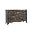 Add a touch of luxury to your bedroom with the Lisbon Marble Top Dresser in Gray. Crafted from Acacia solid wood and eco-friendly embossed oak laminate, this dresser ensures lasting strength and durability. Its multi-step gray finish enhances the natural beauty of the wood, creating a sophisticated ambiance in your room. The genuine white marble top adds distinct character and provides a long-lasting surface. Featuring heirloom drawer construction with English and French dovetail joinery, full extension glides, and finished interiors, this dresser offers both durability and functionality. The top drawers are lined with felt to protect delicate items. With traditional elements like bracket feet and picture frame moldings combined with modern brushed pewter hardware and a fresh gray finish, this dresser offers a timeless style with a contemporary twist. The Lisbon Marble Top Dresser is the perfect blend of elegance and practicality for your bedroom.
