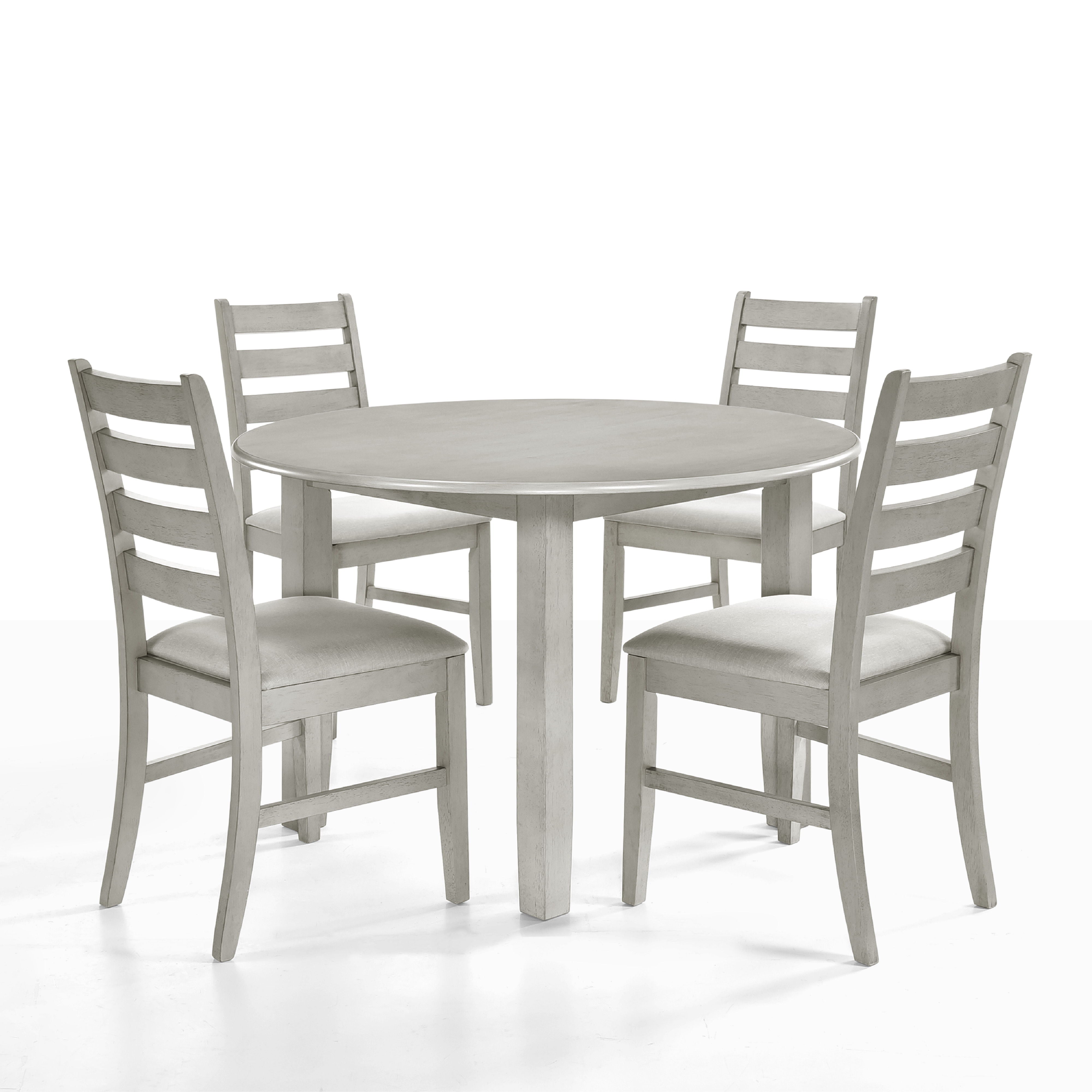 Experience the Pascal Dining Room Set featuring a round wood table and dining chairs. Crafted from a blend of solid Rubberwood and manufactured woods, this set ensures long-lasting durability. The solid wood chairs are reinforced with side base stretchers for enhanced stability. The rich, sophisticated finish is achieved through a meticulous multi-step process, highriching the natural beauty of the wood with rub-throughs and glazing. Each chair is designed for optimal comfort, with high-density foam cushions covered in easy-care 100% polyester fabric. The 47-inch round dining table provides ample space for four, making it the perfect gathering spot for intimate dinners and game nights. The Pascal setโ€™s design is versatile, featuring subtly rounded edges, tapered legs, and elegant ladderback chairs that blend seamlessly into transitional, farmhouse, and contemporary decor styles. This dining set offers both comfort and timeless elegance, making it a beautiful addition to any dining room.