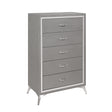 The Huxley 5-Drawer Chest combines contemporary glam with durable construction for a stylish addition to your bedroom. This vertical dresser is crafted from manufactured woods and eco-friendly decorative laminate, ensuring it will stand the test of time. The design features clean lines with metallic accents and flared silver legs, adding a modern touch. Its rich finish provides a sleek, sophisticated look that is both timeless and modern, highlighting the metallic accents and smooth surfaces for a chic and polished aesthetic. The quality drawer construction includes English dovetail joinery and smooth-rolling center glides for long-lasting operation. Functional and fashionable, this chest offers ample storage for clothing, with chic, crystal-studded drawer pulls for easy access.