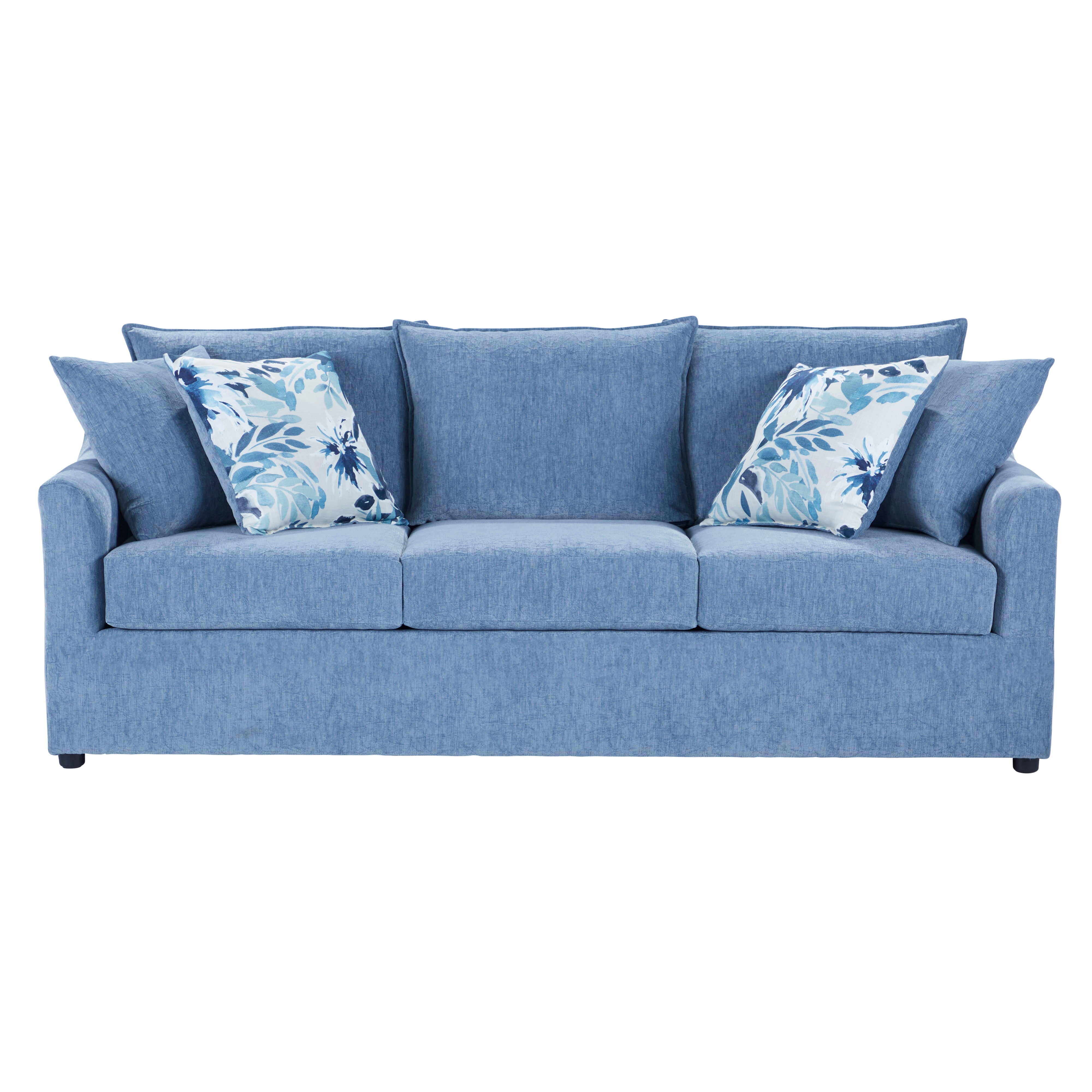 • Cozy-Easy Care Fabric: 100% Polyester slate blue upholstery is carefully tailored and complemented with floral accent pillows.