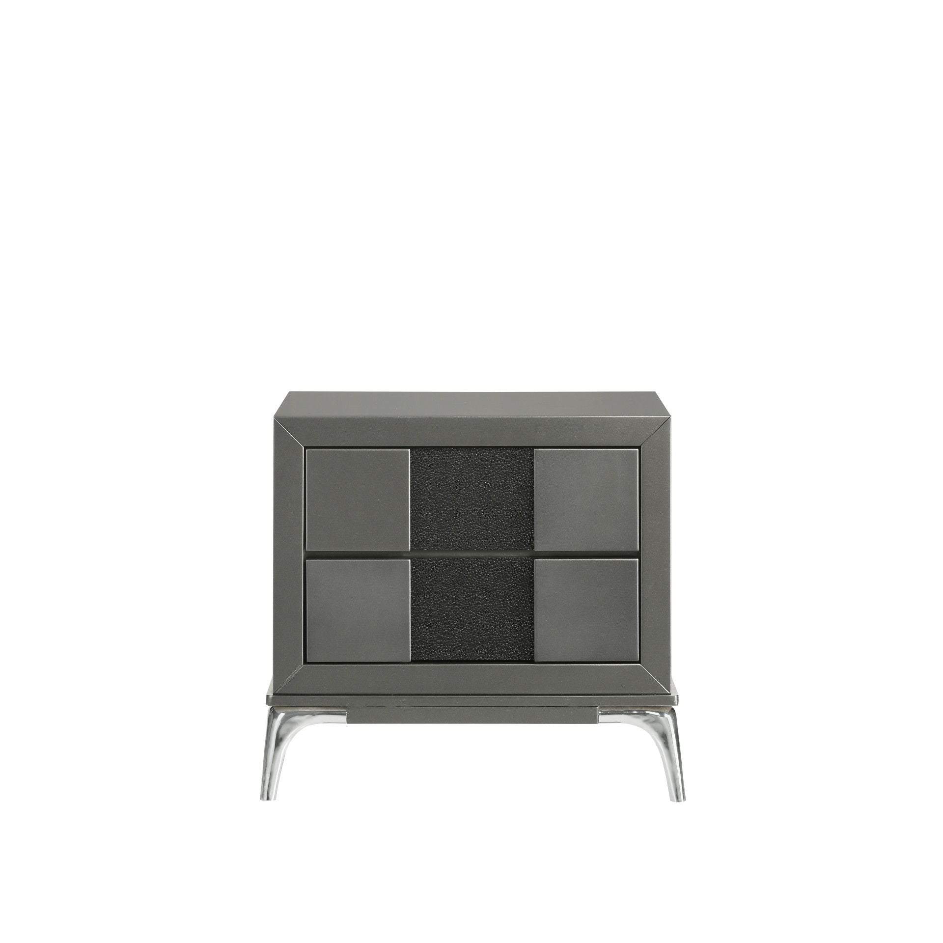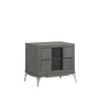 Discover the Nocturne 2 Drawer Nightstand, a testament to modern design and functionality. Constructed with the robustness of Rubberwood solid wood and the finesse of Okoume veneers, this nightstand promises durability and a touch of elegance. The slate gray finish, with its subtle sheen, harmonizes with textured charcoal accent panels, offering a visual and tactile experience that complements any bedroom decor. The drawers are a highlight, gliding effortlessly on ball bearing slides, and their interiors are finished to perfection, ensuring your belongings are housed as beautifully as they are accessible. With two spacious drawers, this nightstand offers ample storage for all your bedside necessities. The silver legs add a final touch of sophistication, anchoring the piece with a contemporary flair that is both striking and practical. This nightstand is not just a piece of furniture; itโ€™s a seamless blend of style and utility, designed to enhance your living space.