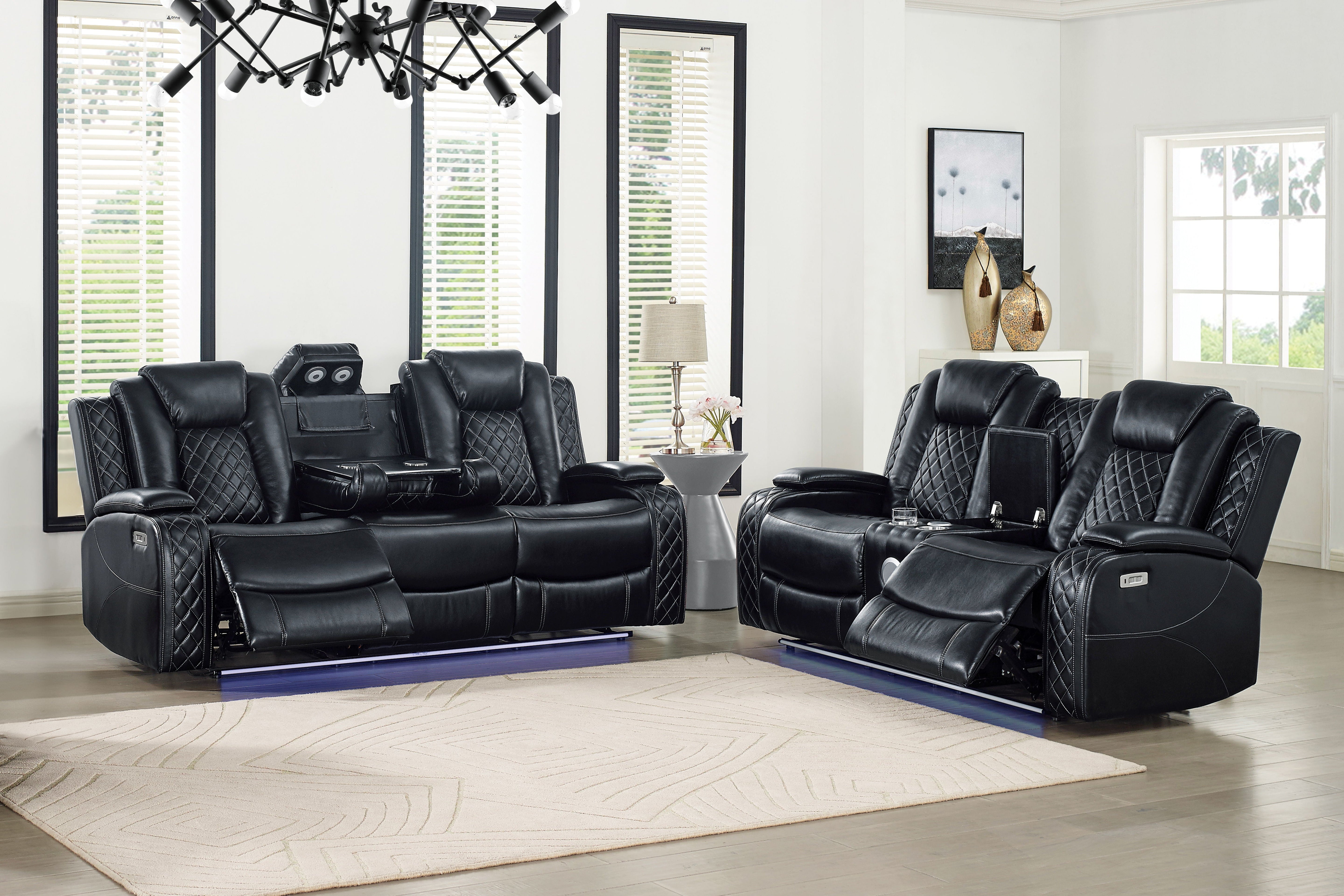 The Orion II Reclining Sofa Set offers both comfort and functionality. Crafted with a sturdy frame of hardwoods and manufactured wood, it promises durability and strength. The upholstery, made of 80% polyester and 20% PU, provides a soft, breathable seating experience. Smooth reclining mechanisms allow for easy adjustments, letting you relax at your ideal angle. High-density foam and pocket coil cushions ensure support and long-lasting comfort. Its sleek design features white contrast stitching, adding a stylish touch, while lift-up pillowed arms hide storage compartments for added practicality. The center console includes a storage cubby, drink holders, and USB ports, with Bluetooth speakers and theater lighting for a complete entertainment experience.