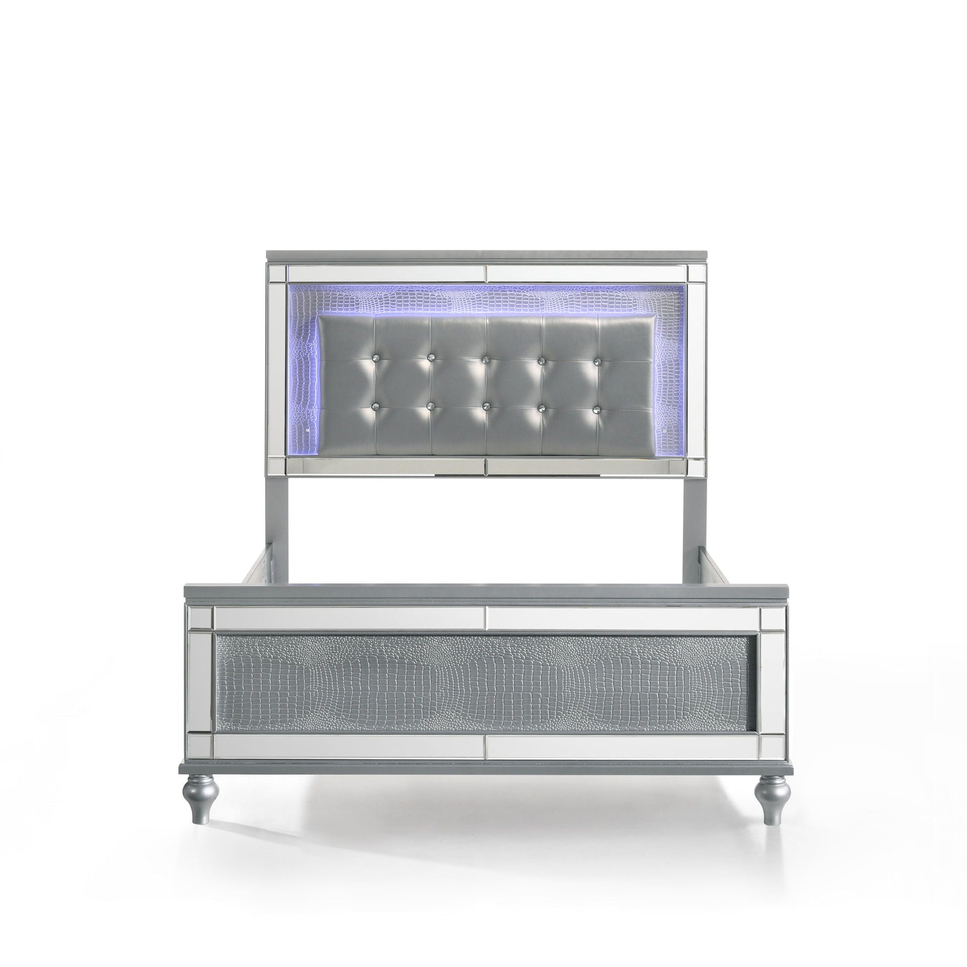 • Glitz and Glam Details: Crystal button tufted padded headboard, gleaming Silver finish and mirrored trims evoke a Hollywood glam appeal.