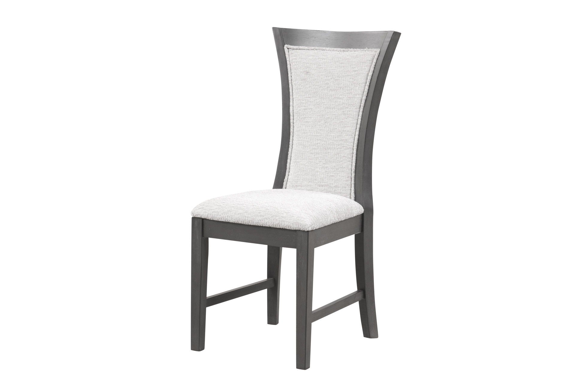 The Flair Dining Chair set combines durable craftsmanship and sleek, modern design to create an inviting and functional addition to your dining space. Expertly constructed from solid rubberwood, these chairs offer long-lasting stability and strength, ensuring years of dependable use. The distinctive gray finish is applied through a multi-step process that enhances the natural wood grain, adding a touch of sophistication to any room. Comfortable seating is provided by plush foam cushions, covered in soft, textured 100% polyester fabric that is both cozy and easy to maintain. The gently flared backrest gives the chair an airy, open feel, while the thick welting along the fabric adds a stylish, tailored touch. This set of two chairs combines practicality with modern appeal, making it a smart and stylish choice for your dining area.
