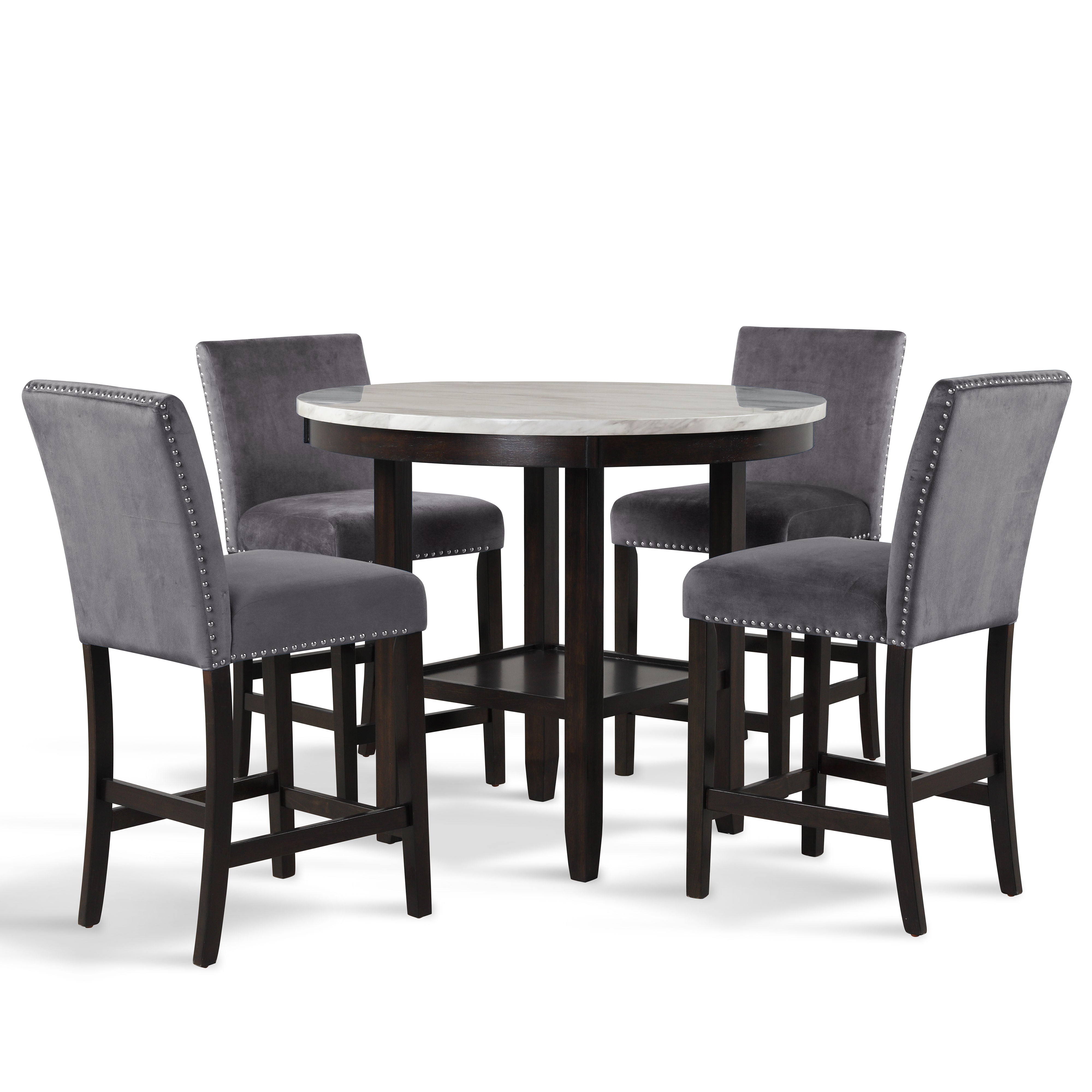 The Celeste 5-Piece Counter Dining Set is an exquisite combination of modern sophistication and enduring craftsmanship. This set includes a chic 42-inch counter table with an espresso base and a faux marble top, accompanied by four stunning gray velvet chairs. Crafted from solid Rubberwood and high-quality manufactured wood components, the dining set is designed for longevity, ensuring a lasting addition to your dining space. The glossy finish on the tabletop provides both heat and water resistance, ensuring easy cleaning and protection from wear. The white and gray veined faux marble top, complemented by deep espresso legs, creates a contemporary and glamorous ambiance. Luxurious seating awaits with the soft and durable 100% polyester velvet fabric covering sumptuous memory foam cushions, offering both comfort and easy maintenance. The stability of the counter chairs is enhanced by four base stretchers, which double as convenient footrests. Tailored for elegance, the rich and luxurious colors of the velvet chairs are enhanced by silver nailhead trim, providing a sparkling final touch to this impeccable dining set. Elevate your dining experience with the Celeste counter dining setโ€”a fusion of contemporary glamour and enduring quality.